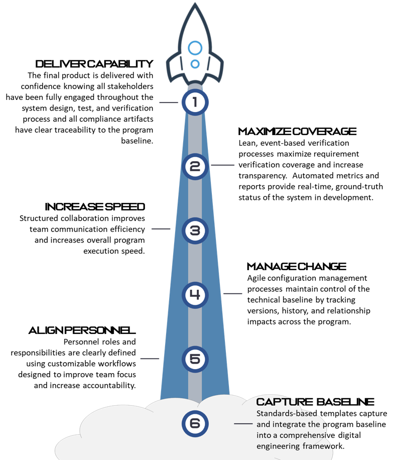 Tightly couples systems engineering and test teams to keep your organization focused on delivering a product that satisfies system baseline requirements and maximizes the re-use of engineering data.